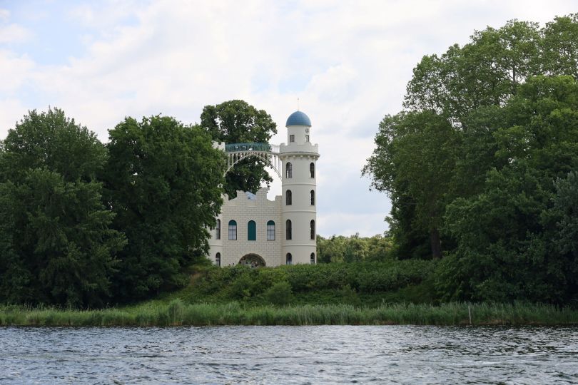 Wir machten uns gegen 9:30 Uhr auf den Weg Richtung Südwesten mit dem Ziel der Pfaueninsel kurz vor Potsdam. Es ging ein Stück die (breite) Havel entlang in Richtung Wannsee. Nun waren deutlich mehr Segelboote und Fahrgastschiffe unterwegs. Das Wetter war sommerlich warm mit schon recht böigem Wind. Frank suchte intensiv nach einer Möglichkeit zum Anlegen, aber zum Ruderclub Wannsee bei stärker werdendem Wind abzubiegen war keine Option. So fanden wir hinter der Pfaueninsel einen Anlegeplatz in Nähe einer Badestelle und konnten dort kurz Kraft tanken.