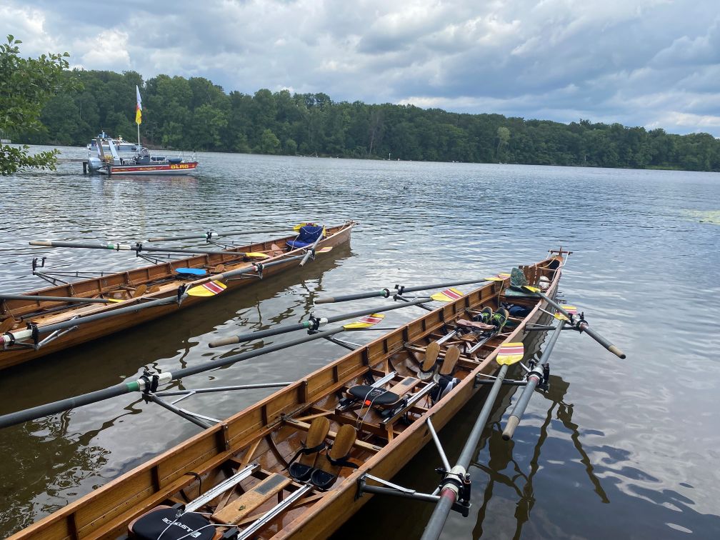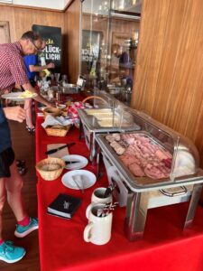 Nach einem reichhaltigen Frühstück mit traumhaftem Blick auf Steg und See konnten wir schon beim Frühstück die ersten Ruderer bei Erwärmung und Fertigmachen der Boote beobachten. Wir teilten „unsere“ Boote ein, ein Vierer, Hellas, und ein Dreier, Tine Hilz. Es gab von den Berlinern eine Frage zu unseren Shirts: ob denn die Brücke darauf die eingestürzte Brücke in Dresden sei, zum Glück aber nicht.