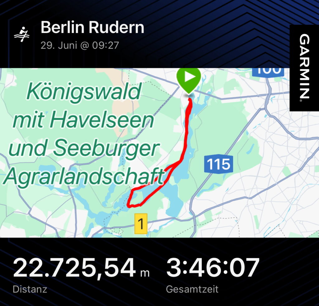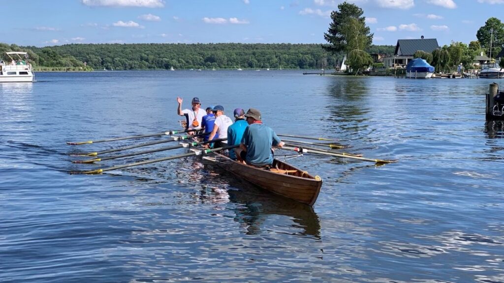 Mit einstündiger Verspätung, unser Wirt hatte verschlafen, gab es Frühstück auf der Terrasse. Die Besatzung eines Achters unterhielt uns mit Frühsport. Dann wurden die Boote fertig gemacht und wieder hinaus auf die Havel. Manche durften nun zum ersten Mal steuern, mit ruhiger Unterstützung der Anderen.